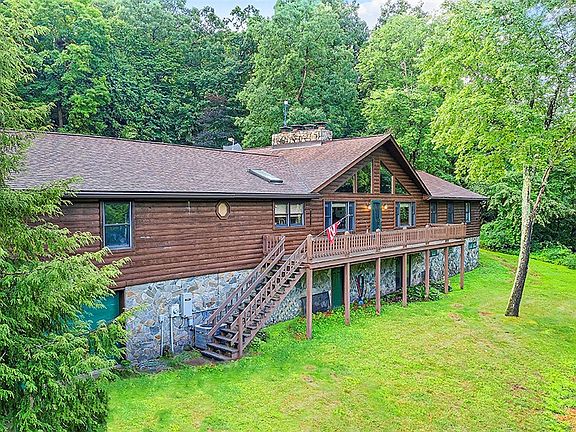 4 Bedroom sprawling home on nearly 9 acres, has an abundance of unique features. The entrance opens to cathedral ceilings with walls of windows. The stone floor-to-ceiling central pillar features a two-way wood burner. Newly updated kitchen with custom-built center island that spans nearly the entire home width, allows plenty of room to entertain. Huge walk-in pantry also houses the refrigerator to maintain the streamlined focal point of this kitchen. The kitchen flows to the living room/family room complete with projector TV, keeping the open concept throughout. The other side of the stone pillar is a dining room area and hallway that leads to the bedrooms. The main bedroom features its own deck to the back and a spectacular master bath that is a must-see! Down the spiral staircase there is a game room and the largest office space you’ll ever experience… and that’s just the finished portion.. there’s also a ton of storage space, water filtration system, and well water reserves.