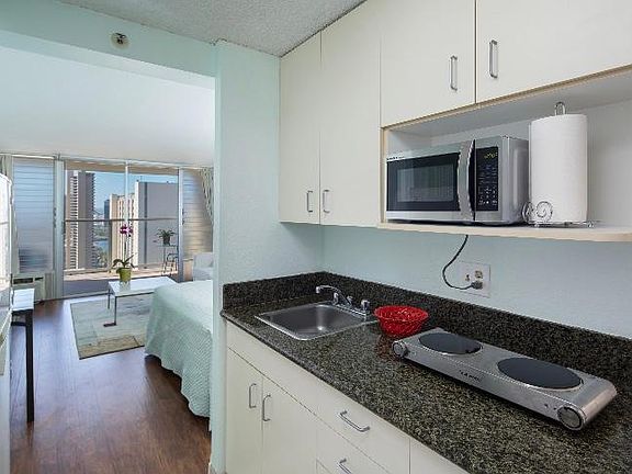 Furnished studio apartment located in the heart of Waikiki a block away from the International Market Place. Fully equipped kitchenette. Great Amenities which include use of pool, hot tub, barbecue grills and gym (with a one time $5 registration fees) Small mini mart located within the building stocked with all essentials. Large size lanai offering a great view of Waikiki Parking not included but can be purchased from the attendant at the parking garage located in the building. Minimum 1 month lease