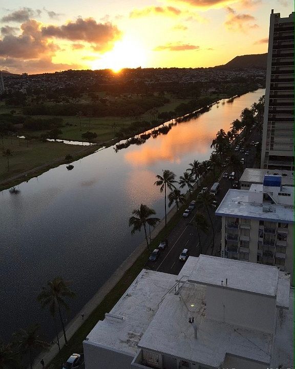 Great corner unit on the cooler side of the building facing the mountains. Views of the mountains, Diamond Head, ocean, canal. Short distance to the beaches, shopping, restaurants, International marketplace. The building offers a lot of amenities 24 hour security, pool , sauna, exercise room , store on the 6th floor.