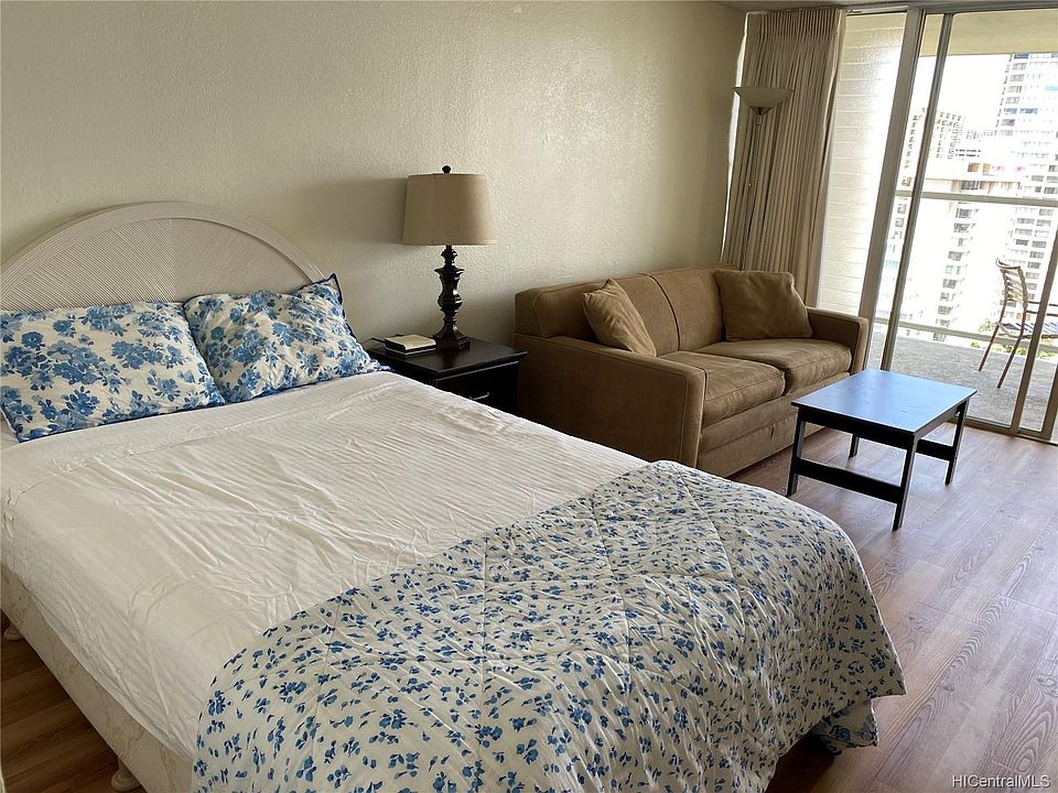 Available furnished studio at Island Colony on 20th floor. Convenient location within walking distance of Waikiki Beach, shopping, and restaurants! Ala Wai Canal and city views! This renovated unit includes new vinyl flooring, a new bathtub, a full size bed, a sofa bed, kitchenware, window air conditioning, and a specious lanai. Building amenities: 24/7 Security, BBQ, Community Laundry, Convenience Store, Pool, Sauna. Utilities included with rent: Electricity, water/sewer, hot water, internet, and basic cable TV. Long term lease. Six months minimum. No pets. No smoking. No parking.