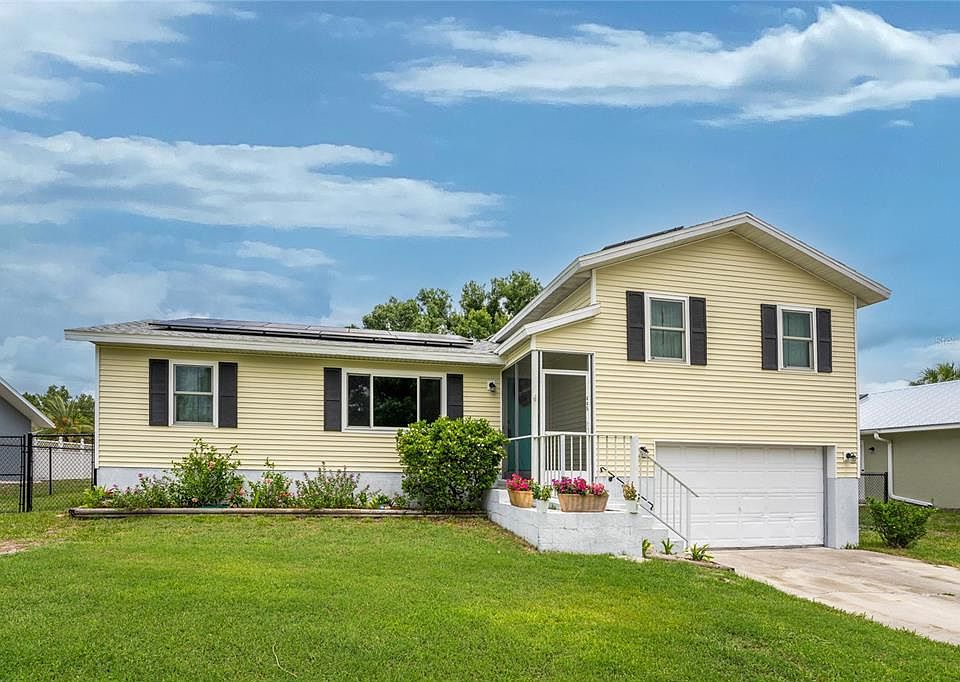 Charming split-level 3 bed 2 bath 2 car-garage POOL home. This property is decked with hurricane impact windows, new vinyl siding, 2024 ROOF, 2022 A/C, 2022 resurfaced pool, and SOLAR PANELS. Walking in you are greeted into the living room which flows in the dining room and onto the galley-style kitchen. Off the living room sits the spacious Primary Suite. On the second floor, you’ll find the two guest bedrooms and guest bathroom. This property is FENCED in, on CITY water, and located OUT of the FLOOD zone – no flood insurance required. Schedule your private showing today!