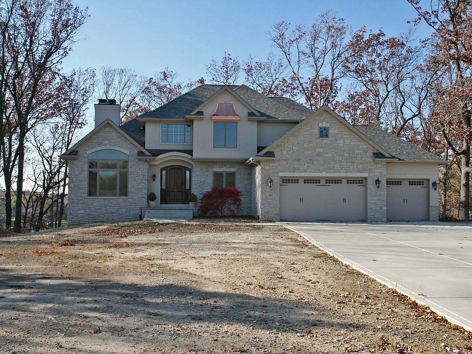 Quality & attention to detail is what you will find throughout this 1 acre lakefront beauty built by Heartland Homes! 4 BD, 4.5 BA home has unbelievable hilltop views of the lake throughout all 3 floors. Main floor boasts scraped Brazilian cherry HW in hall & foyer. LR has cathedral ceilings, fireplace, built-ins, huge open kitchen w/ some upgraded appliances, island & wood coffered ceiling above eating area. Deck off of sunroom & master BD. Master offers a walk-in closet w/ closet organizers, lighted box ceiling, lakefront views, & a beautiful master BA w/ marble & porcelain tiles w/ a large shower featuring dual shower heads & an ever-so-relaxing rain head. You will find wainscoting & crown molding on all 3 levels. Upstairs offers 3 BD & 2 full BA. Downstairs features a theatre rm, wet bar, enclosed stone 3 seasons rm w/ fireplace, work shop area, & full bath w/ dog shower. Enjoy the peace & serenity of the location of this spectacular home! Home is being sold in as-is condition.