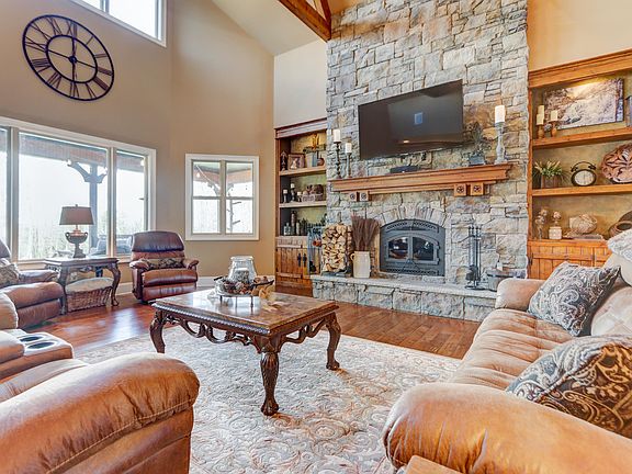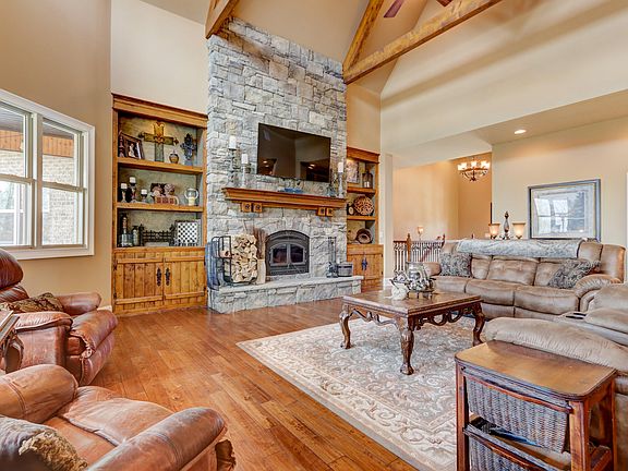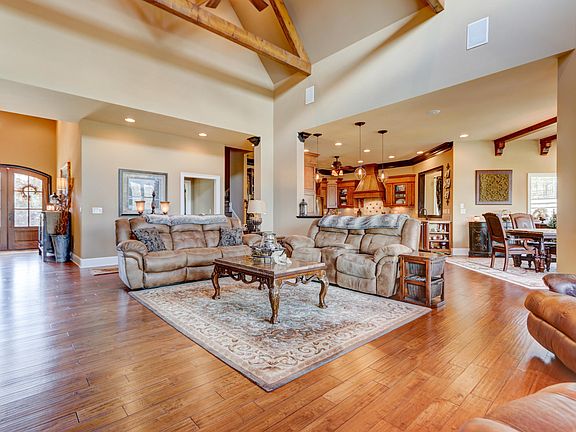 Prestigious gated community, cul-de-sac, Parade of Homes, custom build welcomes you with soaring cathedral, wood beamed ceilings, floor to ceiling stone hearth wood burning fireplace, open concept to formal dining area and kitchen with leather granite, undermount microwave, copper sink, gas cook top, full walk in pantry and office space. Breakfast bar and kitchen island are inviting for guests staying in the main floor on-suite bedroom. Main bedroom on first floor offers control to all home lighting, gas fireplace with remote starter, Peruvian tile with exposed wood accent beams and a individual hot water heater for instant rain shower warmth. Second floor offers bonus room, a bedroom on-sute and a hidden princess/Potter room for that special child/grandchild to enjoy.