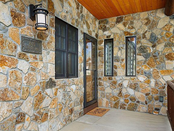The main level showcases vaulted, tongue-and-groove ceilings with dramatic log beams, a striking log staircase, and rich hardwood and slate floors. A stone gas fireplace anchors the great room, while walls of windows frame the surrounding natural beauty. The gourmet kitchen is a chef's delight with custom cabinetry, slab granite, a pantry, KitchenAid stainless appliances, and a breakfast bar—perfect for gatherings. The lower level provides excellent guest accommodations with two bedrooms, a full bath, a large secondary living area, and a generous laundry room with cabinetry and counter space. Outdoor living is effortless with a covered front porch and a flagstone back patio, ideal for enjoying the crisp mountain air.