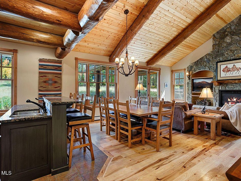 Stone gas fireplaceCovered front porchVaulted tongue-and-groove ceilingsDramatic log beamsPrivate ensuitesCustom cabinetrySpacious bedrooms