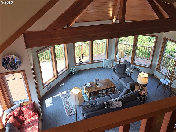 Striking newer contemporary with big views. Dramatic vaulted & beamed wood LR ceiling & a north-facing wall of windows frames giant Neahkahnie Mt & ocean views to the west. Savor both from the wrap-around main-level deck. An exquisitely-detailed stairway leads to upper-level office/den, BR & bath. A lower level BR/family room sports a Murphy bed & a door to the outdoor patio seating area, with a propane firepit. Did I mention the sauna?
