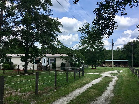 A horse lovers dream! This 5 acre horse farm is turnkey ready. Well maintained DWMH is bright & light with lots of windows & open living space. Features include a huge master BR, his & her baths with jetted garden tub & separate shower, stunning stone fireplace in FR, walk-in closets & separate laundry room. Great outdoor living spaces include a screened back porch, wood grilling deck and above ground pool. The 3 stall barn offers private paddocks, tack room with A/C unit, dutch doors & a front overhang with concrete aisle for tacking up and cross tying. A lighted arena, grass pastures, automatic gate opener, hay shed and a large equipment and run in shed are just a few of the outstanding amenities that make this the perfect equestrian property. This truly is a horse lover's paradise