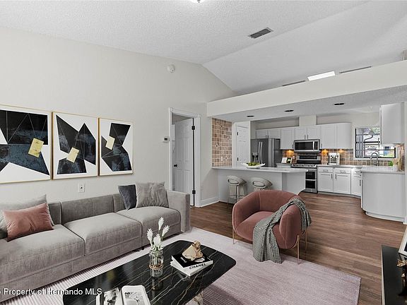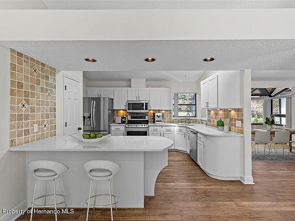 Elegance, Comfort, and a Backyard Built for Entertaining Welcome to a beautifully upgraded three-bedroom, two-bath pool home in Spring Hill, thoughtfully designed for both everyday living and effortless entertaining. Situated on a .23 acre fully fenced lot with no HOA, NO FLOOD ZONE or deed restrictions, this property offers exceptional privacy, freedom, and a host of recent improvements that make it truly move-in ready. Step inside to find 1,761 square feet of refined living space and over 2,200 square feet under roof. Vaulted ceilings and natural light from skylights and sliding glass doors create an open, airy atmosphere. The well-planned layout features a desirable split-bedroom design, brand-new flooring throughout most of the home, and a stunning reimagined kitchen at the heart of it all. Outfitted with sleek quartz countertops, modern cabinetry, a tile backsplash, and all-new stainless steel appliances, the kitchen is both stylish and functional. The spacious primary suite offers private access to the pool, a walk-in closet, and a calm, comfortable retreat. Both bathrooms have been updated with tasteful, contemporary finishes that enhance the home's cohesive aesthetic. Step outside into a screened-in lanai that leads to a large, inviting pool, perfect for morning swims or relaxing afternoons. A covered outdoor kitchen features dual mini refrigerators, a stovetop, and generous prep space. The backyard includes plenty of patio space, a fully fenced yard, and a newly built shed with electricity, offering a flexible solution for storage, a workshop, or creative space. Additional highlights include a brand-new roof installed in 2025 and a smart irrigation system with customizable zones to keep the landscaping vibrant with ease. Located just minutes from Weeki Wachee Springs, Hernando Beach, and Pine Island, and with quick access to the Suncoast Parkway and Tampa International Airport, this polished, thoughtfully upgraded home offers the very best of Florida living inside and out.