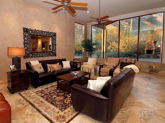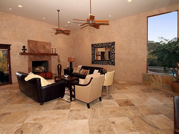 Stunning single owner estate home custom built by Cathedral Rock Const. in 2004.Oversized Hacienda doors, travertine floors,17ft ceilings frame Catalina views. Granite & alder kitchen, SS appliances,2 sinks,2 DW, separate refrigerator & freezer, walk in pantry, raised breakfast bar & eating space. Living room w/granite fireplace, bar w/sink, wine refrigerator, slate countertop. Master suite has electric fireplace, walk in shower & spa tub. All Bedrooms en suite. Private gate to property, covered patio, pool & spa along w/outdoor fireplace, restful tree covered back patio & 3 car garage. One level except upstairs media/family room w 3/4 bath, mountain & city views, could be 5 BD. Jewel box powder room, voluntary HOA