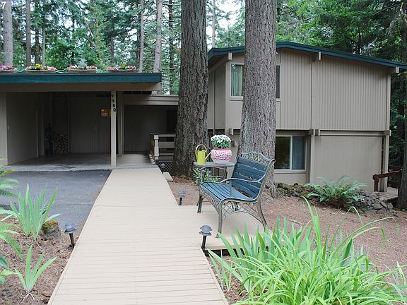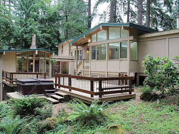 Located at the end of a culdesac bordering forested park land, short walk to elementary & middle schools, spacious well cared for home features huge back deck w new hottub, large living & family rooms ea w FP, vaulted open beam ceilings, skylights, wood floors, kitchen open to dining area, custom builtin cabinetry, enclosed sunroom, utility room, sitting area on upper level. Covered car port, garage w workbench, tons of storage.