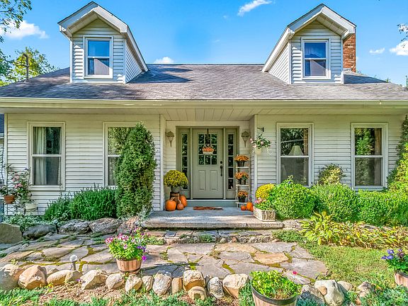 Welcome to your peaceful outdoor oasis! This charming 4 bedroom, 2 bath cape-cod is tucked away in a beautiful secluded setting surrounded by nature. Enjoy modern comfort with recently updated kitchen and baths, newer windows, and a cozy wood burner in the living room to help cut heating costs. Sliding glass doors lead out to a rear patio - ideal for relaxing or entertaining. Main floor laundry. Attached 2 car detached garage. The property features blacktop driveway, new shed (great for storage), and sits on wooded acreage with abundant wildlife. The beautifully landscaped yard is filled with perennials, fruit trees, and raised garden beds - a true outdoor paradise. Broadband internet is available at the road for easy hookup. This is a must see!