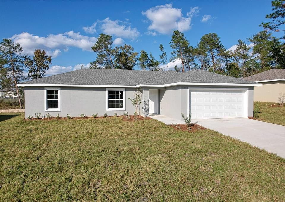 Beautiful NEW home in Marion Oaks! As you enter the home you will find an inviting and open floor plan with cathedral ceilings in the large Living room, dining area and eat in kitchen all done in attractive neutral colors. Luxury Vinyl Tile throughout all living and common areas and carpet in bedrooms. Upgraded Stainless steel appliances, wood cabinets and luxury laminate countertops, pantry and large center island are some of the top features in this open kitchen. Smooth close cabinets and comfort height cabinets are additional extra features showing the quality and care of this builder. Stainless steel microwave is included. Beautiful ceramic tile in both bathrooms. Master bathroom has a fully tiled shower and it is expertly installed floor to ceiling! Spacious master bedroom with walk in closet. Inside laundry room. Large patio in the backyard. Construction is now completed and is ready for move in. Pictures are of this house with additional photos showing other nearby homes available with other color options. This home is quality built and you will love the layout.