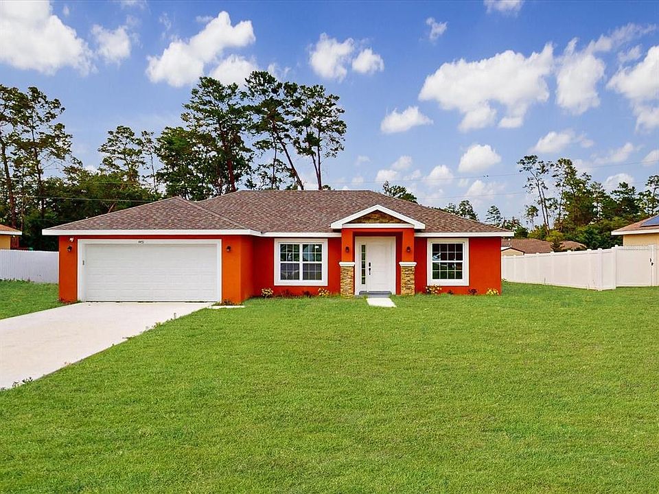 There is no need to keep searching, this is the home for you! A brand-new home with several upgrades and located in the amazing area of Ocala, near all of Florida’s major attractions such as theme parks, shopping centers, pretty lakes and trails, and more! Located in Marion Oaks, this home is perfect for anyone, from first-time homeowners to someone relocating, to even investing! Entering the splendid home reveals the true beauty of the home. With a big open floor plan and soaring high ceilings that have stylish fans which will leave the house feeling cool this upcoming summer, take in just how marvelous this house is. With the dining room, family room, and kitchen being so close to each other enjoy the vast and easily accessible space available in the home. The kitchen is a true delight, perfectly matching the rest of the home while also containing necessary upgrades, such as stainless-steel appliances and granite countertops. The upgrades do not stop as the house is equipped with well insulated walls to reduce noise, granite window stills, laminated floors throughout the whole house mixed with ceramic tiles for the wet areas, a superb sliding glass door in the master bathroom, granite countertops in the bathrooms, a laundry room, epoxy resin flooring in the garage illuminated by modern chandeliers, and so much more! With three bedrooms and two bathrooms there is enough space for you to enjoy the serenity of the home with your family! Inquire for more information and to make an appointment.