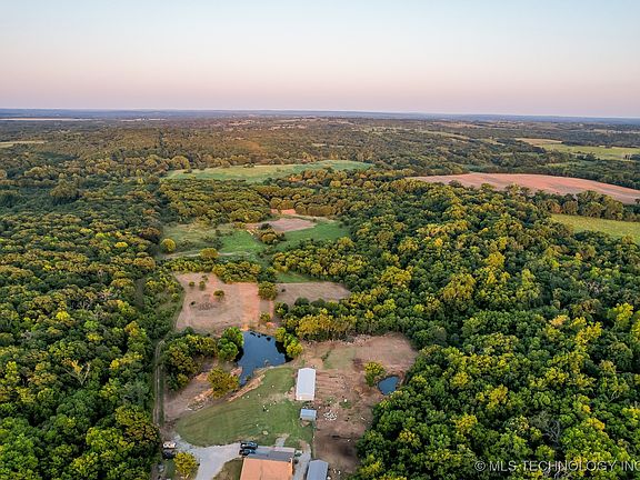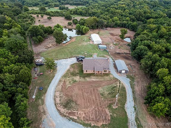 Nestled down a dead end road lies this very private, secluded property on 30 +/- acres. With a gated entrance, the property consists of rolling landscape with wooded areas, food plot for wildlife, two barns, storm cellar, a large stocked pond, and more! The largest barn is a 26 x 70 x 9 with 5 roll-up doors and 1 walk-through door. Completed with spray foam throughout. The smaller barn is 20 by 40 with one roll-up door and 1 walk-through. Built in 2008, this brick 2000 sqft (courthouse) home has 3 bedrooms and 2 baths equipped with a modern features. Home offers spacious open-concept kitchen and living room with 20 foot ceilings and a wood burning fireplace perfect for family gatherings. Granite countertops throughout the home, stained concrete floors, and much more. Covered patio with gorgeous view. With the abundant wildlife, you'll enjoy the large bass, turkey, hogs, and some of the largest deer in Oklahoma. Can be combined purchased with MLS#2430812