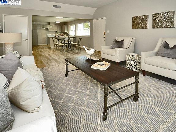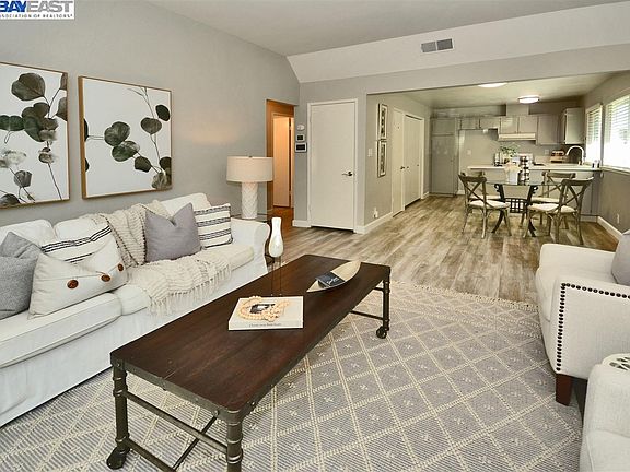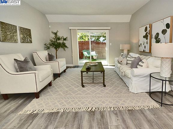 Fabulous 1-story Condo in prime location! Close to top-rated schools, BART, public transportation, 580/680 FWY’s, dining and shopping. Enjoy living in this beautifully updated and sun filled single level condo with two bedroom and one bathroom. Move-in condition. Light and bright. Modern décor, featuring updated kitchen and bathroom, fresh interior paint, laminate flooring throughout, dual pane windows with 2” blinds and much more. Inviting living room with large sliding glass door to spacious patio. Functional kitchen with Quartz counter tops, stainless steel sink and breakfast counter opens up to dining area. Two good sized bedrooms with large closets and windows. Remodeled bathroom with newer shower enclosure, glass shower doors, vanity and large mirrored medicine cabinet. Laundry closet with stackable washer/dryer unit and storage shelves. Enclosed patio with storage shed. Two assigned parking spaces (one covered) with direct access to unit. Low HOA fees. Community offers sports court, playground and greenbelt.