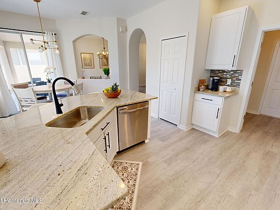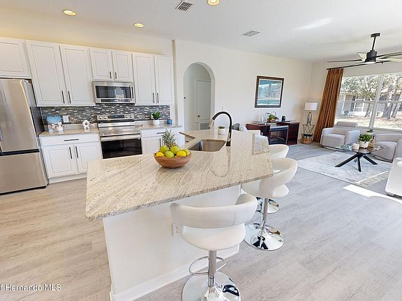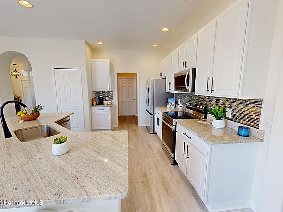 TAXES INCLUDE THE CDD FEE. Welcome to the epitome of luxury living in the exclusive gated community of Sterling Hill. This pristine and completely remodeled open concept three-bedroom home on a cul-de-sac is waiting for you! The home is light and airy where luxury meets modern cozy. This stunning home is all new inside and out, you don't have to do anything! Inside you will benefit from luxury vinyl plank flooring that is totally waterproof and scratch resistant and runs throughout the entire home. Walk in and you are greeted with a spacious living and dining room great for intimate parties and holiday gatherings with floor to ceiling windows overlooking the lush backyard. As you walk through, your chef's gourmet kitchen boasts new 'smart' Samsung stove & refrigerator, 42' cabinets that give you plenty of storage space, all new granite on a massive island, a huge walk in pantry and sunny breakfast nook great for that morning cup of coffee. The family room is true open concept open from the kitchen with double sliding doors and large windows that allow the outdoors to shine in! The primary bedroom is a generous size with large windows overlooking the backyard, two walk in closets and a renovated en suite bathroom with new lighting, 2 new sinks with granite, soaking tub, large shower with a rain shower head and water closet. The secondary bedrooms provide privacy on the opposite side of the home with a tub/shower combo remodeled hallway bathroom with new lighting, fixtures and vanity with granite. The spacious indoor laundry room then leads to a freshly painted two car garage. Outside there are 2 patios overlooking the large backyard, one uncovered to enjoy the fresh air and sunshine and one large covered lanai that is perfect for entertaining or relaxing with a good book enjoying the quiet neighborhood. Every detail in this home has been carefully designed to elevate your living experience from the new roof, new A/C, fresh paint, new modern lighting and ceiling fans, new appliances, upgraded granite countertops in the kitchen and bathrooms and all new fixtures, new sprinkler system and timer. Sterling Hill is a resort style community for all ages with a large clubhouse with billiards room and entertaining social room, 2 swimming pools, tennis courts, basketball court, volleyball court, stand alone gym, playground, tot lot, splash pad, dog park, and even an RV parking area. The Social Committee plans a lot of activities and get togethers throughout the year including holiday parties and ice cream socials with face painting for the little ones. Come live your new lifestyle in Sterling Hill in the heart of Spring Hill's nature coast only 5 minutes from the Suncoast and Veteran's Expressway giving you a quick 45 minute commute to Tampa, Clearwater Beach, or the sponge docks in Tarpon Springs. Or stay local and enjoy canoeing on the Weeki Wachee River and Nature Preserve within 10 minutes along with the local beaches of Pine Island.