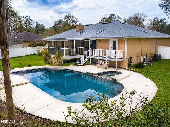 Rare opportunity to own your own tropical paradise in the heart of Mandarin nestled on a large, quiet .71 acre cul de sac lot that backs to preserve w/ creek. Large family room w/ fireplace, vaulted ceiling & screened porch overlooks lush, tropical back yard w/ palms, pool & spa. **NEW ROOF, new floors in bedrooms, new A/C & pool refinished in 2017. Eat in kitchen has corion counters, stainless appliances (except fridge) & eating area. Large owner's suite has a walk in closet & new tile shower w/ seat in bathroom. 2nd bedroom has a new deck overlooking & leading to pool area. New water softener, pool pump & SO MUCH MORE! Walk to Clarks Fish Camp & Hood Landing Boat Ramp, NO HOA so you can store your boat & water toys. Close to shopping, dining, San Jose & 295. All appliances convey.