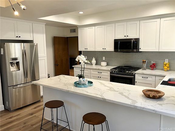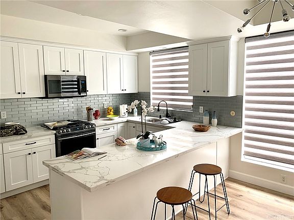 Prime Sherman Oaks Location! Located on a quiet cul-de-sac st. This newly remodeled, corner unit with a large balcony, 10Ft ceilings, has an excellent floor plan - bedrooms are on opposite sides from each other and both feature full bathrooms. The master bathroom has a large 2 person jacuzzi tub and a large standing shower with double vanities. An oversized master bedroom with a large walk in closet. In unit laundry for convenience. A gas fireplace in the living room, a built in bar with a granite counter top. Recess lighting. Lots of storage/closet space throughout the unit! Recently update A/C. New Kitchen Cabinets, New quartz counters, New appliances. New baseboards, New floors. This is a must see! Close to major FWYs. Walking distance to Ventura blvd, major restaurants, shops, supermarkets, westfield shopping mall, and lots more! Building amenities include an in ground heated pool/spa, sauna, rec room with a bar, ping-pong table, guest parking, and a soon to come fitness room. HOA includes EQ insurance!