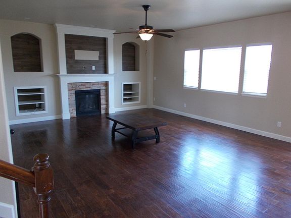 Lease this Spacious and thoughtfully designed, this home offers an open-concept kitchen that flows seamlessly into the dining and living areas, allowing you to stay connected with family or guests while preparing meals. The living room features custom built-ins with lighting, a cozy gas fireplace, and beautiful manufactured hardwood floors throughout the main level. Upstairs, you'll find four bedrooms, including a master suite with double doors, a tray ceiling, and plenty of luxury. The master bathroom boasts double sinks with granite countertops, a soaking tub, a separate stand-up shower, and a large walk-in closet. A second full bathroom with double sinks and granite countertops serves the other bedrooms. Convenience is key with an upper-level laundry room, eliminating the hassle of carrying laundry up and down stairs. The lower level offers an unfinished basement, ideal for storage or ready to be customized to fit your needs. Outdoors, enjoy a fully irrigated front and back yard, with a gate in the backyard that opens directly to a green space and park perfect for outdoor activities and relaxation. Rent $2800.00 per month includes trash 12 or 24 month lease tenant responsible for all untilties trash included in HOA must have renters insurance schedule a showing today