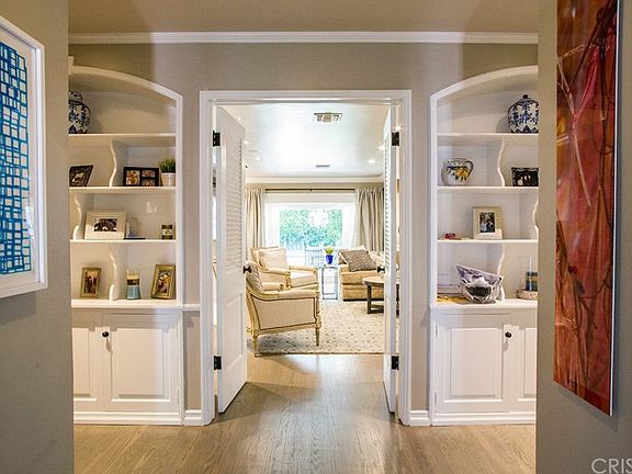 Studio City's picturesque Landale Square is home to this one-story traditional on a sweeping corner lot with five bedrooms and four bathrooms. Once you pass through the gorgeous entryway you'll find a spacious great room with oak floors, gas fireplace, built-in shelves, surround sound and french doors. When you're ready for movie night, at the touch of button, both a retractable screen and projector will descend from the ceiling. A chef's kitchen offers a suite of state-of-the-art Jenn Air appliances...double oven, range, refrigerator and two dishwashers. Other highlights include a pot-filler, hidden ice maker and a retractable stand-mixer shelf. Off the kitchen you will find the work hub of the house, perfect for helping with homework while dinner is cooking. The space is rounded out with a gorgeous dining room behind a set of glass paned doors. The master suite is a true oasis with vaulted ceilings, french doors to the rear yard, motorized window shades, surround sound, walk-in closet. The master bath includes jetted tub with LED lighting, Toto toilet, bidet, double sinks, oversized shower and heated towel rack. There are four additional bedrooms and three bathrooms to complete the living space. The lush backyard is a true retreat with an outdoor dining space, fire pit, Mugnani pizza oven, built-in BBQ, Pebble Tec pool, spa and all-weather sports court. It's California living at its finest!