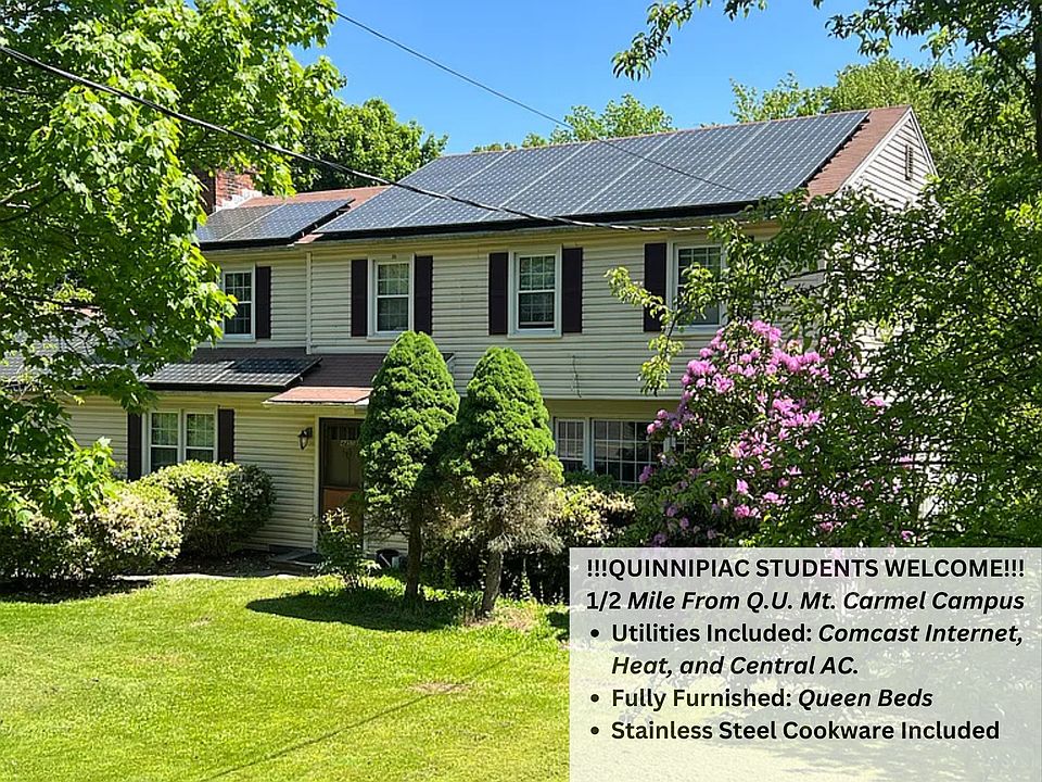 Beautiful home .7 miles from Quinnipiac and Sleeping Giant State Park. Five bedroom 3 1/2 bath house. Bedrooms fully furnished with queen size beds, all new bedding and pillows. Livingroom has leather furniture and a large desk to study. Kitchen has granite countertops and all stainless cookware, dishes and utensils. Dining room has a table that seats eight. All utilities are included with the rent. That includes electricity, Comcast internet, cable tv, heat and hot water and A/C. Home is 100% green no fossil fuels. Home is heated and cooled by mini-split heat pumps. All hardwood floors throughout. Electric vehicle charging included. Landlord takes care of landscaping and snow removal. Pets can be discussed.