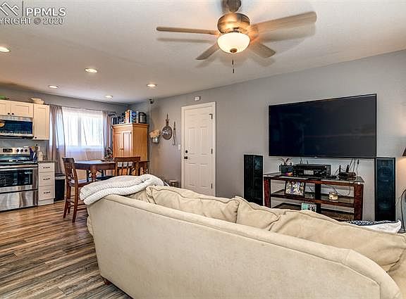 Adorable 3 bed, 1 bath, 1 car garage home with beautiful mountain views from the front door. This updated home features neutral colors throughout, gorgeous wood flooring, newer carpet, updated lighting, newer windows and a/c for those warm summer days. The kitchen offers stainless steel appliances, updated cabinetry, granite countertops, eating area plus a service door to the garage. Master bedroom with ceiling fan and two additional bedrooms share the full bath. Updated bathroom with tile surround, newer vanity, ceramic flooring and a 4x6 laundry space. Garage includes shelving plus a service door to the large backyard. Attached shed for extra storage. Microwave ('20), Sewer line ('19), Air conditioning ('18), Roof ('18), Hot water heater ('10) and Furnace ('07). Close to shopping, restaurants and minutes from Fort Carson.