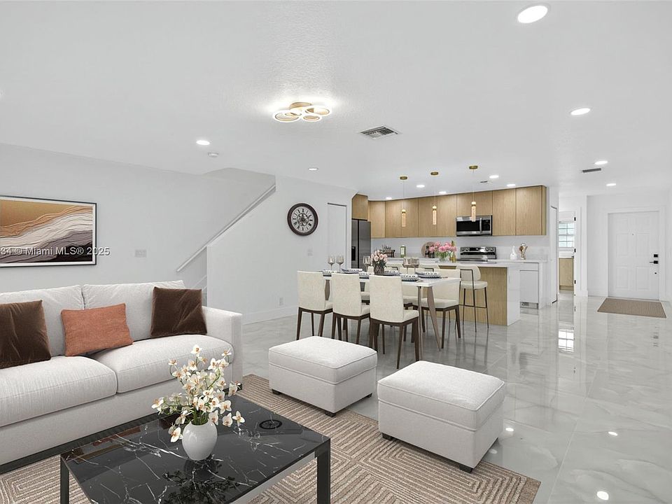 Virtually Staged. Motivated Seller offering 20k credit to buyer. Spectacular fully remodeled 3BD/2.5BA townhome featuring a modern custom kitchen with quartz countertops, island with elegant pendant lights, stainless-steel appliances, and a luxurious beige, gold, and white color combination. Enjoy open concept living with new ceramic tile flooring, fresh paint, and recessed lighting. The primary suite includes a walk-in closet and a remodeled bathroom with double sinks, custom vanity, new tiles, and modern lighting. Additional bathrooms feature new vanities, mirrors, shower tiles, bases, and updated accessories throughout. Home also includes a spacious garage, laundry room, and large fenced patio with newly installed grass and fresh landscaping. Schedule your showing today!
