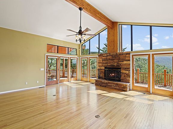 Wood burning fireplaceCenter islandExposed wood beamsWall of windowsPrivate deckGreat roomSoaring vaulted ceilings