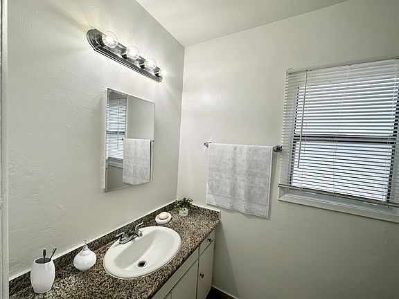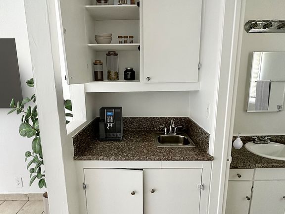 Step inside and enjoy fresh tile flooring, white walls, and abundant natural light that make the space feel airy and inviting. The unit includes a compact kitchenette with countertop space, cabinets, a microwave, refrigerator, and sink, perfect for easy meal prep. The updated bathroom features granite counters and a clean, modern finish.