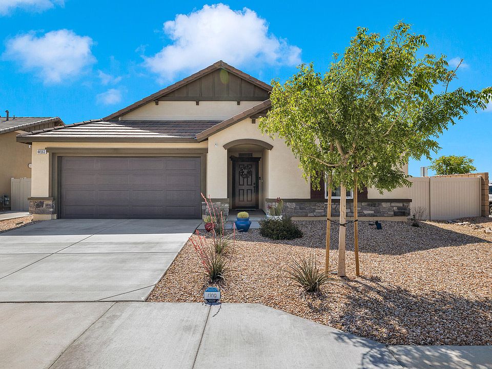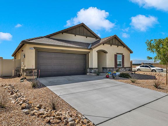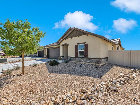 Introducing your perfect home! Nestled in a quiet cul-de-sac with breathtaking mountain views, this 2-year-old home offers 3 beds and 2 baths. The spacious master suite features a spacious walk-in closet and a master bathroom with a separate bath-tub and shower, complemented by an upgraded vanity and double sinks. Revel in the beauty of vinyl wood flooring and plush carpeting throughout the house. The stunning kitchen is equipped with new backsplash, a large kitchen island with ample storage, and full appliances. Step into the backyard with custom desert landscaping. This home is located in a tranquil neighborhood with a great school district and easy freeway access.