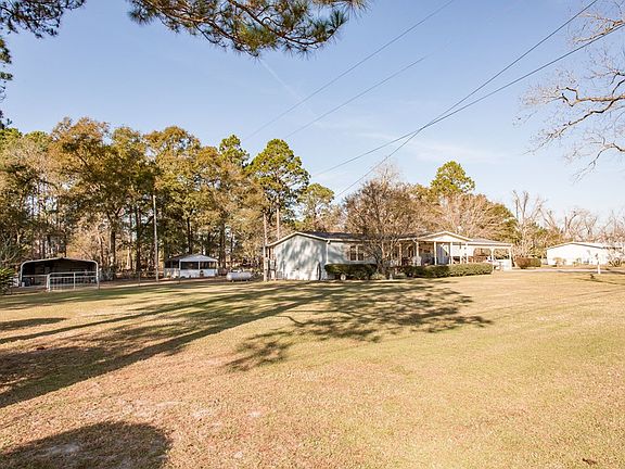 This is a fantastic 4 bedroom, 3 full bath home that sits on 2.42 acres just north of Waycross in the Jamestown area. The lot features a fenced in back yard that includes the wooded side acre inside the fencing. There are several shops and buildings in the back yard as well as a concrete patio and wooden porch connected to the house. The front currently has a ramp for wheelchair accessibility that leads to a nice sized front porch. A concrete drive leads you to the double carport and has a large extra pad for additional parking or turn around space. The inside is spacious with living, dining and kitchen all in the same central area with 2 guest beds and bath to one side and 2 owners suites on the other side. The laundry is a great size with a sink, cabinetry and room for an appliance such as an extra freezer or fridge. The sunroom on the back might be your favorite room in the house with sunlight pouring in the wall of windows offering views of the back yard.
