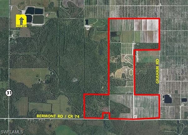Located 2 miles east of SR 31 on the north side of Bermont Rd/CR 74 in Charlotte County. Currently farmed, the property has one mile of frontage on Bermont Rd/CR 74, is two miles deep and includes 2 mobile homes and a 100' x 200' packing house. Also known as "The Red Neck Yacht Club."