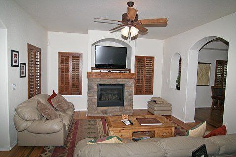 Must-See Beautiful Rancher - Backing to the Bluffs and Open Space! The outdoors will come in each and every day! You'll enjoy the serenity of wildlife and view the natural setting from every window to the rear! Sprawling rancher offers nearly 2,000 sq feet on each level. The main floor includes a formal dining room, great room and must-see gourmet island kitchen including all the bells and whistles! Expanded main level Master Suite includes vaulted ceilings, his and hers walk-in closets, luxurious 5-piece master bath including his and hers vanities, and sitting area with fireplace! There are beautiful arches and wide hallways giving a wonderful open feel! The Additional highlights include: central air to stay cool each summer, main level 2nd bedroom with full bath nearby, main level laundry, extensive wood flooring, fully landscaped, covered front porch, Mahogany wood blinds and Knotty Alder shutters, 9 ft ceilings, stucco exterior, coffered ceiling, and huge basement is finished to include 2 bedrooms with additional bath in between. Stay organized with bonus walk-in storage space or finish as needed! Wonderful location with easy access everywhere -- from UCCS to downtown, to the Powers Corridor, to I-25, or even Academy Blvd! See it Soon!