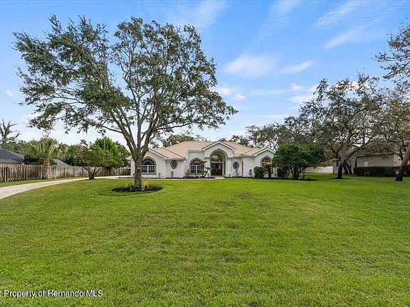 Rare Gem Pool Home! Highly desired gated community of Primrose Lane. This home is everything and more! The floorplan consists of 3 bedrooms, 3 bath, 3 car garage with an in-ground pool on a ½ acre lot at the end of the cul de sac. Over 3600 sq ft and under roof and 2,523 sq ft home. This executive home has been completely updated inside and out. Once you're through the electronic gate, you will immediately notice the community sense of home ownership pride, love for trees and charming landscaping. Upon arrival, you will enter a grand entry driveway with new brick pavers throughout. The landscaping is fresh and low maintenance. The front double door entry is very inviting. You will then walk into an open floor plan with a foyer, front living room overlooking the pool and a formal dining area with new Applewood hardwood laminate flooring. There is an office with a tray ceiling looking out the front of the yard with great windows. The entire home has 10 ft high ceilings with all new, updated lighting and ceiling fans with fresh paint throughout. As you continue further, you will notice an oversized kitchen with an abundance of cabinets and drawers with brand new LG appliances and granite countertops. Nearby is the eat-in kitchen area with both overlooking the family room and pool area. These rooms are newly floored with vinyl plank tile style waterproof flooring. The double door master bedroom is large in size and is a split floor plan. The master bathroom features a large soaker tub, a large enclosed shower stall and a water closet. The two other bedrooms with walk-in closets are separated with a shared guest bath. There is also a pool bath. Both are fully updated with new vanities and toilets. The pool area has a lovely, covered lanai area with a nice, relaxing pool and a removal security fence for safety. This area also has a true workshop/storage room. It is a bonus place to use as you wish. Other features and updates include a gorgeous tile roof, freshly painted exterior, well for sprinklers, 2021 air conditioner and a 2021 hot water heater. The community features an electronic gate, streetlights, underground utilities, mature landscaping and a community mailbox station located across the street from the home. There are only 72 lots in this exclusive community. It's also located near shopping, restaurants, medical facilities and just 15 minutes to the famous Weeki Wachee Springs and 25 minutes to the beach of Pine Island to soak up the sun and enjoy sunsets. Nothing needs to be done here. It's ready today. A quick closing is ok as well. Please call for your private showing.