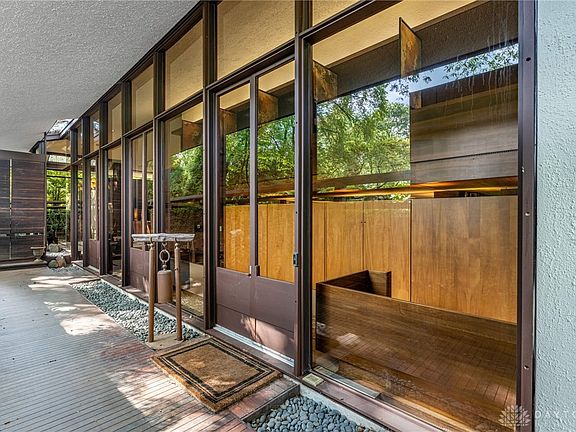 Step into timeless elegance in this private retreat on over an acre. Nestled on a serene, wooded lot, this architecturally striking home takes inspiration from the historic designs of Frank Lloyd Wright blending natural materials, large windows and expansive glass walls. The stunning Great rm with woodburning fireplace has 2 story floor-to-ceiling glass walls that flood the interior with natural light and offer panoramic views of the landscape and patios. The formal dining rm with WBFP has a wall of glass and walk-out to the 28x16 Brazilian hardwood deck. The kitchen has custom cabinetry of natural hardwoods, sleek granite countertops and high-end appliances. Tucked discreetly into the hallway, the butler’s pantry/bar offers custom built-ins with granite counters and bar sink. The library/den has custom built-in shelving and cabinetry. Close by is a full bath with Italian glass tile and walk-in pantry/mud room. Two bedrooms and 2 baths are located upstairs, including a primary suite with a private balcony and an en suite bath with natural stone and warm wood finishes. 2nd bedroom has en suite bath with a Japanese soaking tub. The lower level has a family rm and private 3rd bdrm or office, a full bath, and laundry rm. The walk-out lower level opens to a stone patio bordered by mature trees. Thoughtfully placed pathways lead down the acre-plus lot. This home has been impeccably well maintained. From pristine wood floors, oak plank ceilings to custom built-ins, every detail has been respected and cherished. Home systems have been consistently serviced and maintained. Recent updates: Roof 2025, interior painting 2020, exterior painting 2025, new garage door 2020, Hardwood floor refinishing 2022, water heater 2020, Deck refinished 2025. Bonus: Whole house generator. 30 amp RV charger. Bathrooms have radiant floor heat. Located at the end of a cul-de-sac. Whether you're entertaining on the deck or enjoying the gardens, this home is a true sanctuary of design and nature.