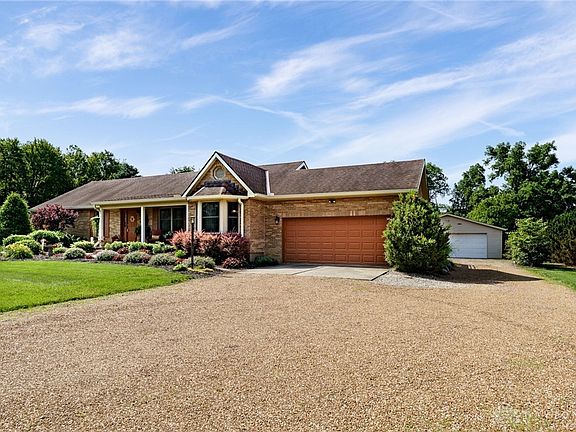 Beautifully designed and meticulously maintained ranch home set on 1.7 acres of peaceful, private land. Exceptional space indoors and out! GE Cafe Series appliances, quartz countertops and custom wood counters, a striking copper farm-style sink, and pullout cabinetry for smart storage. Bathrooms are remodeled. Convenient 1st floor laundry. Large dining room. The basement offers the possibility of 2 additional bedrooms, plus a large rec room for entertaining or watching the big game! The screened-in porch is truly the heart of the home, perfect for enjoying quiet mornings or evening gatherings. Step down to the large patio with propane fire pit, great for roasting marshmallows on a fall night. Woodworkers, car enthusiasts or creatives will love the detached 2-car garage with AC and heat, which is currently a 30' x 40' industrial-grade woodshop- a rare and highly functional space. HVAC 2024; lush yard with room to expand! Schedule a private showing today!