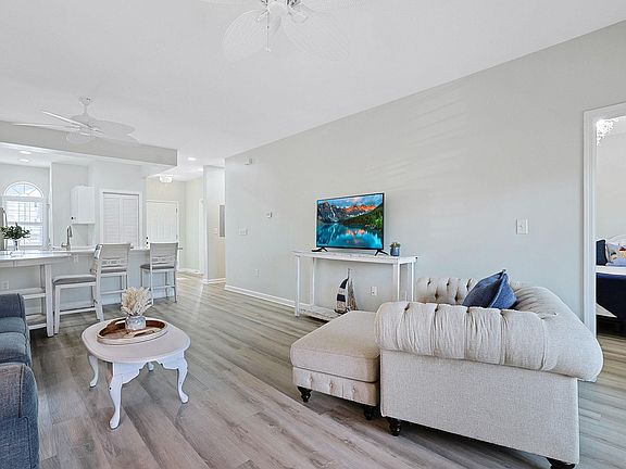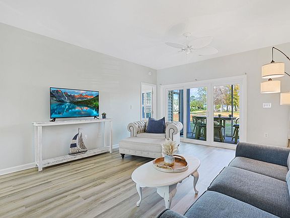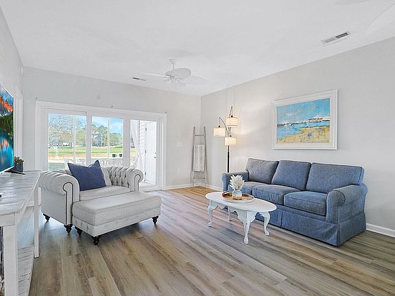 Enjoy watching the golfers putt on the 12th green and tee off on number 13 from your screened-in back porch in this first floor upgraded 2 bedroom 2 bath condo located in the prestigious Moorings at Eastport complex. This piece of paradise begins with wood look LVP flooring, stylish furnishings, a fresh coat of paint, plantation blinds throughout, smooth flat ceilings, a classic living/dining room combo with a sliding glass door that opens up to the relaxing screened-in back porch. The fully equipped kitchen offers a new slate appliance package, a breakfast bar, subway tile back splash, quartz counter tops, a practical pantry, and includes an abundance of cabinet spaces. The primary bedroom suite presents a custom designed walk-in closet, tranquil golf views, private access to the primary bath that includes a vanity with a raised vessel sink, a gentleman height comfort station, and a deluxe step-in shower. This delightful condo is completed with an additional bedroom, a full guest bath, extra storage, new water heater installed in 2024, and a laundry closet with a stackable washer/dryer. This condo affords you easy access to the beach and golfing along with all of the other activities and happenings in Myrtle Beach and Little River including fun eateries, award winning off-Broadway shows, public fishing piers, Little River Waterfront, and intriguing shopping adventures along the Grand Strand. Conveniently located to your everyday needs, including grocery stores, banks, post offices, medical centers, doctors’ offices, and pharmacies. Check out our state of the art 3-D Virtual Tour.