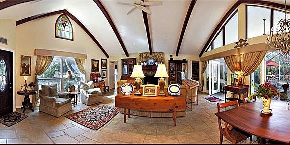 PALM RIVER ESTATES - QUIET COMMUNITY with OVER-SIZED LOTS with SPACE FOR A BOAT - 5 minutes from beaches. Thick palms at rear lot line create a secluded naturescape and poolside sanctuary. RARE! Easy in-out circular driveway and 2 car garage. This unique 3BR 2BA with Den/Office or FUTURE WALK-IN CLOSET offers a ranch-style home and open floor plan with split bedrooms and LOTS OF WINDOWS. There are two A/C systems. The large central great room with wood burning fireplace is bright and has a CATHEDRAL CEILINGS creating a spacious feel. The stained glass window in the west facing peak of the cathedral ceiling is dynamic at sunset. Home is PERFECT FOR ENTERTAINING as the entire rear of the home, with FOUR DOUBLE FRENCH PATIO DOORS, opens to the HUGE COVERED LANAI with slate deck and a large upscale pebble finished pool. The huge lanai has screening and allows a flow-through feel to additional living area. The updated kitchen with pass-thru window features exquisite cabinets and rich dark granite counters. Porcelain floors throughout. NO HOA FEES. NEW ROOF. LARGE LOT NEAR THE BEACH. BUYER TIP: COVERED LANAI ADDS 576 SQ FT TO LIVING SPACE. A+ SCHOOL DISTRICT.