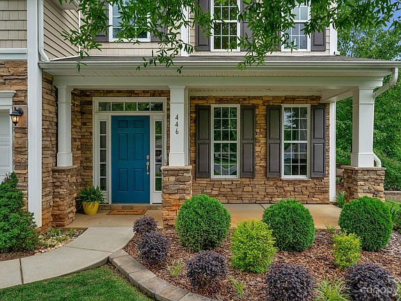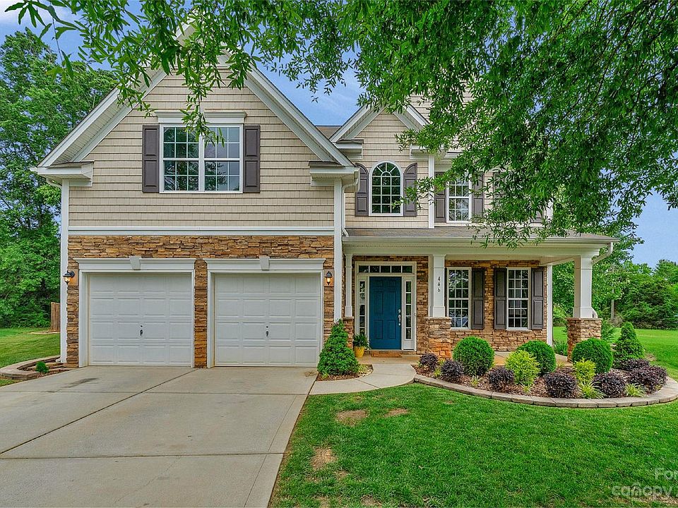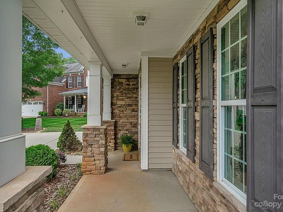 Welcome to Fair Oaks home located on private culdesac with covered front porch & grand 2-story foyer. Crown moldings and elegant tray ceiling in dining room. Spacious kitchen with granite counters, stainless appliances, & adjoining breakfast area. New refrigerator(2022), dishwasher(2021), microwave(2023). Main level bedroom & full bath for guest stays or office. Crown molding & window casings throughout. Primary bedroom upstairs with ensuite & double sink vanity, soaking tub, separate walk-in shower. Two add’l bedrooms plus bonus/bed & laundry room upstairs. Private, level, fully-fenced backyard with 3 access points, large playset(2021) on bed of wood playground mulch. Dedicated garden bed. Newly hardscaped front & backyard with large patio. Tuffshed outdoor shed(2022). Irrigation system(2022) with separate meter box. Neighborhood swimming pool, picnic table, grill area, walking trail with natural area and creek. Zoned to SC schools and lower taxes yet steps from Charlotte & NC border.