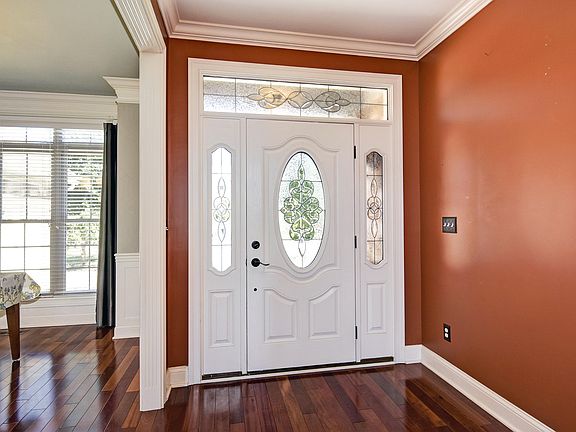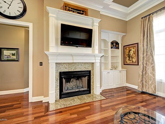 Spectacular 1.5 story, 5-bedroom, 3.5-bath home on a beautifully landscaped 1-acre lot on an very quiet cul-de-sac, in the Orchards at Plum Creek in northern Spencer County just minutes from Jeffersontown. This beautiful open floor plan home has all the amenities with granite countertops, hardwood flooring, amazing wood trim work and 9' ceilings throughout. Open the front door and the large foyer opens directly into the 19' by 16' great room with its towering 12'6'' coffered ceiling, wood burning fireplace with built-in's, intricate crown molding, a half bath and a wall of windows for natural light. The adjacent dining room has its own wall of windows for more natural light, wainscoting, a beautiful chandelier and has easy access to the great room, kitchen and foyer.