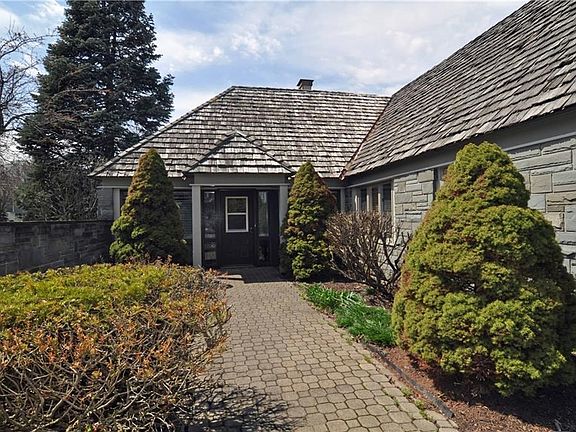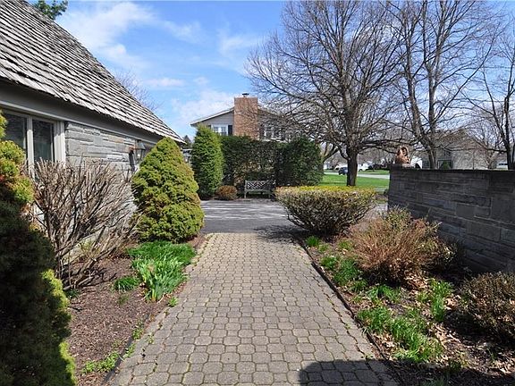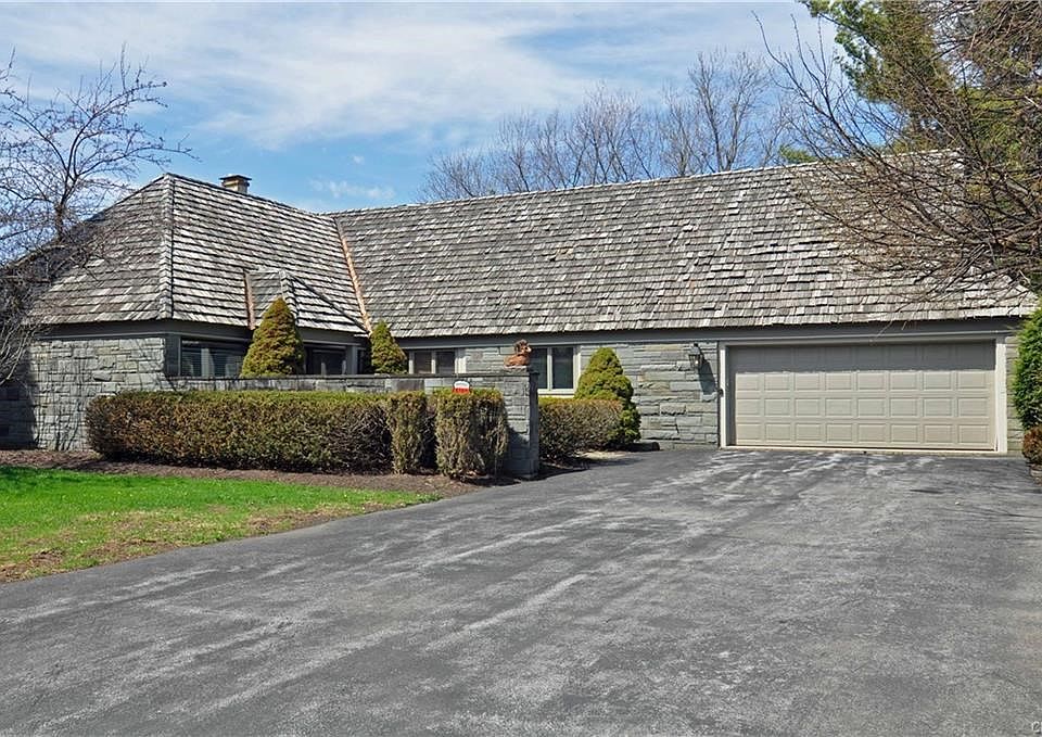 This Stone home,on the 14th fairway,inspired by Frank Lloyd Wright, is Gorgeous!Enter from the private entrance bordered with perennial gardens,into a flagstone all-season porch.The foyer accesses the Cathedral ceiling open living and dining area with a wood burning fireplace.The designer galley kitchen boasts solid surface countertops,loads of whitewashed cabinetry and a sunny breakfast area overlooking the front gardens.The window wrapped Great Room shines with stunning views,a gas fireplace,built in cabinetry,with a bar and loads of storage.The coffered ceiling is enhanced with accent up-lighting,all overlooking the stone patio and the tree shaded yard.Two bedrooms and a full Jack & Jill bathroom complete the 1st fl.The open stairway leads to 2 bdrms, bath and office.Attached Garage.