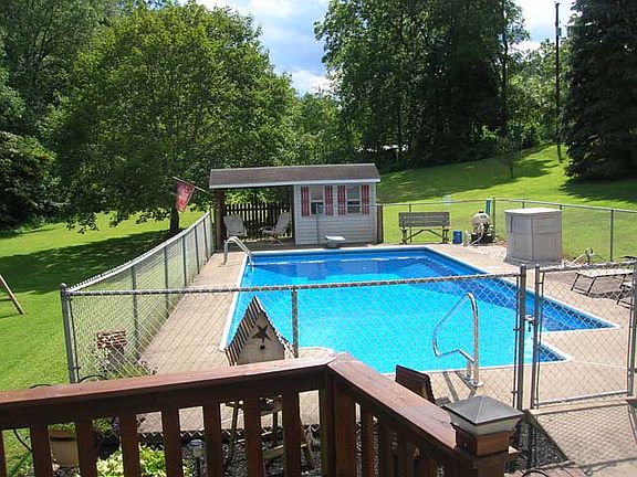 TAKE THE PLUNGE! Everyday will be a vacation with the 16x42' in-ground pool that comes with this 3BR/1BA ranch sitting on 2.28 acres. Fenced in pool area has 8x8' pool house w/8x8' pavilion. Enjoy entertaining on your 32x10' deck. Lower 16x10' deck is covered. Home has new 2013 metal roof & 2003 central air. Newer hickory kitchen. 36x26' 2 car det. garage w/ 20x26' carport. Included are 6 apple & 1 cherry tree. Pride of ownership! Make this #1 on your Must See List!!