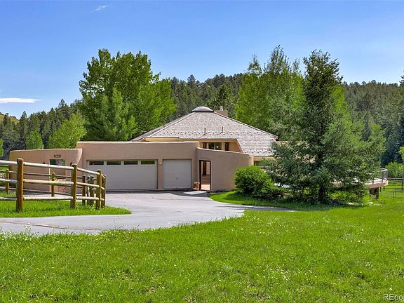 Welcome to 446 Meadow Vista Drive, one of Evergreen’s most iconic and picturesque properties in the heart of Soda Creek. The setting is out of a magazine, almost surreal with a magical creek running through 10.5 acres of sprawling horse property. Soda Creek Trail #11 is easily accessible and rock climbing & hiking in your own backyard is a dream come true. The Southwestern architecture is a breath of fresh air. Rustic log beams hanging from the vaulted ceiling adorn the open layout while the central skylight keeps the room beautifully lit. Every direction, every window offers an interaction with nature, whether it’s the beauty of Soda Creek, views of Bergen Peak or all the wild life. The fresh & breezy kitchen is a great place to eat and gather with new granite countertops & new custom Alder cabinetry or head outside on the deck to grill while you watch the sunset. There is an abundance of outdoor living areas to experience the paradise of the ranch including 3 decks, 1 fire pit area and a patio with an 8 person Caldera hot tub. The primary ensuite is luxury at its finest with a fireplace, private deck overlooking the creek and a spa-like bathroom with a steam shower. On the lower level you’ll find a living room, office, 2 bedrooms with a full bath and an exercise room with access to an enchanting fire-pit area. The large immaculate 4 stall barn is a special part of the property with a tack room, heat, running water & electricity. Although perfect for horses, there are many other ways to utilize this incredible space which can be rented. Watching https://tinyurl.com/446MeadowVistaDrive IS A MUST! You’ll see the private HOA community pond just minutes away perfect for fishing, paddle boarding ice-skating. 20 minutes to Denver. 60 minutes to Copper, Winter Park & Keystone. New carpet & boiler are just 2 more of the recent updates. If you are looking for a lifestyle of serenity, peace & tranquility - you won't find a more unique and incredible property!