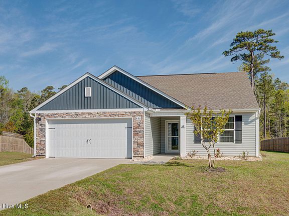 Located in popular and convenient Harrison Cove and built by respected homebuilder LGI, this beautiful 3 BR/2 BA one-story home is a rare find! You'll love the striking curb appeal with exterior stone accents, covered entry, double car garage, and lovely landscaping. This home is situated on nearly ½ acre lot, backing up to a curtain of trees for privacy and tranquil nature views. An open and inviting floorplan features lots of natural light, vaulted ceilings and a seamless transition from the large living room to the chef-ready, white and bright kitchen. The spacious kitchen features abundant cabinets, elegant granite countertops, pantry, breakfast bar and stainless-steel high-end appliances including a NEW Samsung refrigerator. A split floor plan is ideal for guests and for everyday living with two spacious bedrooms sharing a full hall bathroom. Freshly painted throughout with brand new carpet in the secondary bedrooms and living room, this lovely home shows even better than new and it boasts upgrades that are hard to find in new construction, such as an extended 18 x 16 concrete patio and welcoming front storm door. Septic was just cleaned and house was professionally detailed and exterior washed. Located in the award-winning Topsail school district, and only minutes to shopping, beaches and schools, this friendly, tucked-away neighborhood is just what you've been seeking and represents a superb value! Low HOA dues, move-in ready, ideal location and a great-sized private lot....this gem won't last long!