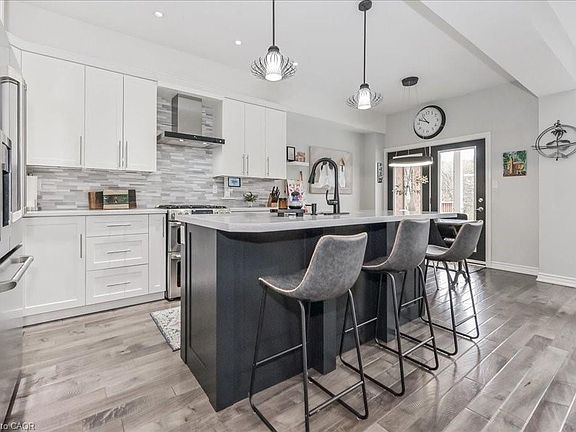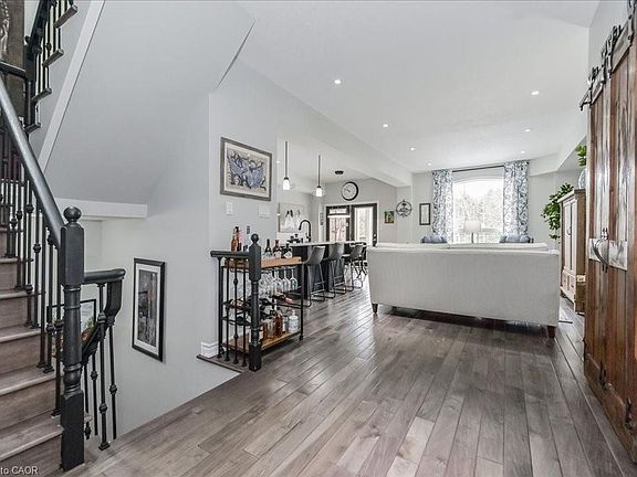 Paradise lost...paradise FOUND! This is the home you've been searching for for years. Stunningly renovated, freehold townhome (no condo fees) backing onto the beautiful Grand River with breathtaking views from numerous vantage points throughout the home. Just wait until you see the Gourmet's kitchen. Gorgeous white wooden cabinets highlighted with Corian countertops and an 88" x 38" island with breakfast bar. Appliances included including a dual oven (gas), fridge with ice/water feature and beverage centre fridge! The entire main floor boasts rich, hand scraped hardwood and you will enjoy the spacious living room and dining room with a walkout to a partially covered 22 x 7'9" TREX deck and has a natural gas hook up for your BBQ. The upper level Primary suite is amazing! Another walkout to a private perch TREX deck (9'4 x 7"8) with unobstructed views of The Grand! The ensuite has been completely remodeled to offer you a MAAX 60" massage jet bathtub, your own steam shower, a heated towel rack and multi-media lit mirror. An huge walk-in closet with extensive built-in organizers. Your laundry is on the upper level and has a convenient folding counter, upper cabinets and a deep stainless sink! Wander down into the basement to check out the warm recreation room offering a 2nd gas fireplace and a THIRD walkout. This one onto an on ground TREX deck covered by the deck above. We also have a 3rd bedroom or den for flexible uses. Updates and extras include a Generac generator, new furnace and central air (2024), roof in 2016 with gutter guards on all eaves and roof shingle heaters to prevent ice damming. All water closets are duo-flush and rite-height for maximum comfort.