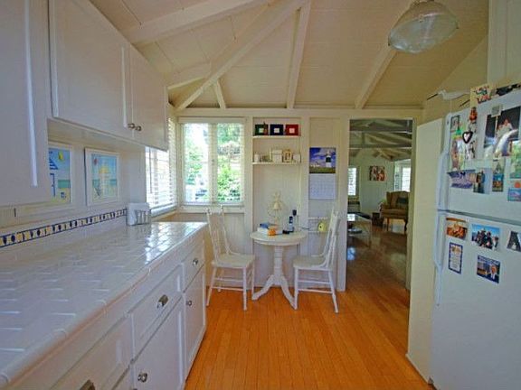 Updated and restored with care, this light and bright cottage features open beam ceilings and fireplace in the living room, and hardwood floors throughout. Dining room with lots of windows. Bedroom has two walk-in closets. Kitchen with upgraded countertops and appliances. Separate laundry area. Large back yard patio. Grassy front yard with picket fence on quiet street. Walk everywhere from this quaint location. Long driveway for two or more cars.
