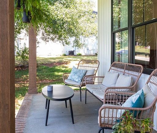 Gas log fireplaceNeutral colorsCustom kitchenOpen-concept designQuartz countertopsTons of natural lightLaundry room with sink