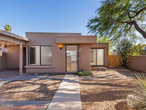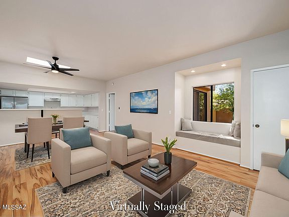 Imagine coming home to this beautifully updated townhouse, where natural light pours in from the kitchen skylight, creating a warm and inviting atmosphere. The modern kitchen, with new stainless steel appliances and sleek quartz countertops, is perfect for cooking and entertaining. The split floor plan features two bedrooms with new carpet, plus primary and guest bathrooms showcasing new vanities, quartz counters, and updated fixtures. Step outside to your private courtyard and patio for stunning mountain views. Enjoy a dip in the community pool or a walk along the Rillito River. Conveniently located near shopping and Tucson Medical Center, this home blends comfort and convenience.