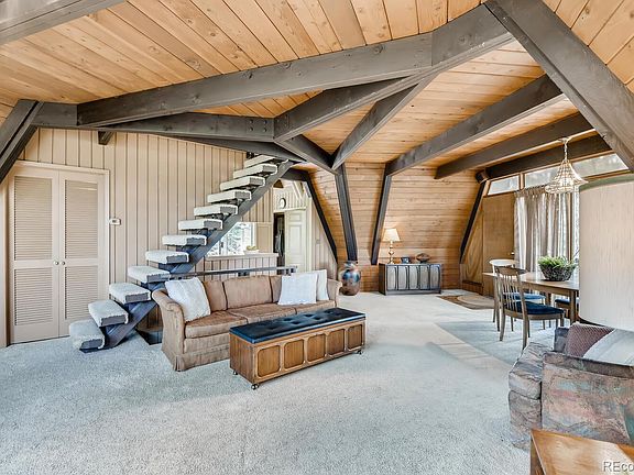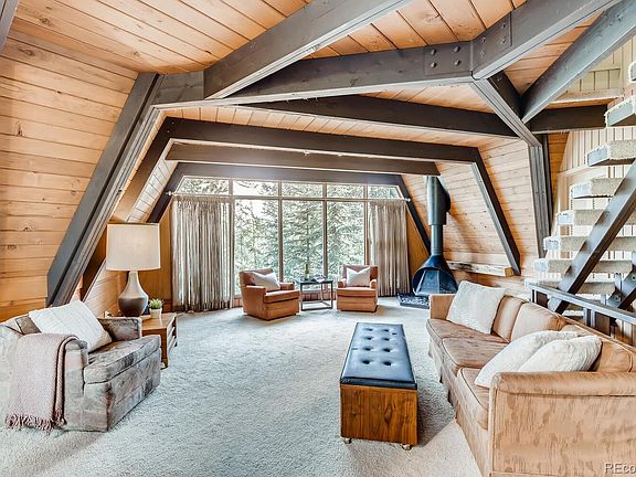 Mid-century modern meets mountain chalet in this unique one of a kind home less than 1/2 mile to historic downtown Evergreen! Gorgeous views surround you everywhere in a very quiet and private setting. You can even hear the river in the evenings! Main level open floor plan features all the right angles with exposed wood and beams throughout with a lot of windows and a fabulous mid-mod retro fireplace. Make this your getaway cabin or live here as your permanent home. This home is on a double lot with several rock outcropping. Opportunity to possibly subdivide to build an additional house (buyer to verify this information). Front of house and main deck face SW and the deck off the kitchen faces SE. Public water and public sewer. Needs a little TLC and is priced accordingly. Fire hydrant is very close to the property which is great for insurance purposes. Don't miss the opportunity to own your little slice of heaven!