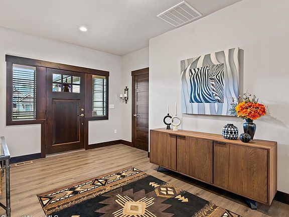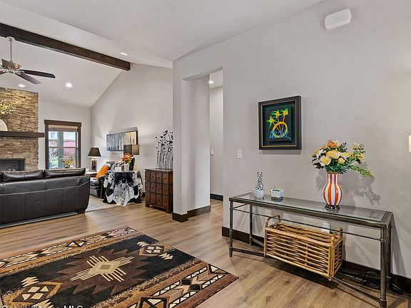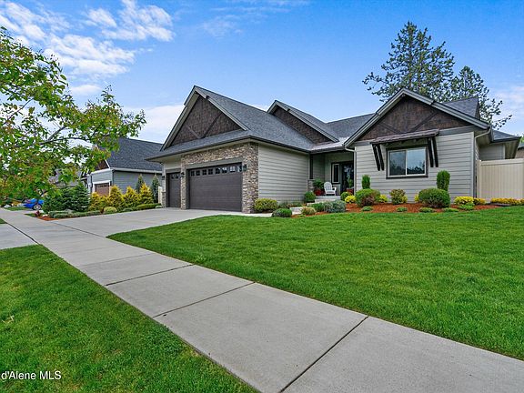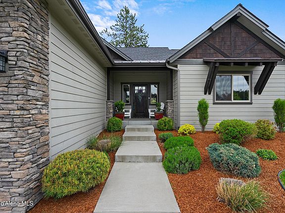 Welcome to this stunning Craftsman-style home built by Aspen in the highly sought-after Alpine Point neighborhood! This designer gem boasts a light & bright, single-level floor plan with soaring vaulted ceilings & a grand floor-to-ceiling stone fireplace. Modern LVP flooring flows throughout the home, complementing the chef's kitchen, which features high-end stainless steel appliances, including a Wolf stove top & Miele dishwasher, along with sleek light fixtures & a breakfast bar. The spacious primary suite offers a walk-in closet & a luxurious 4-piece bath with a dazzling tile shower. The split floor plan ensures privacy, with guest quarters on the opposite side of the home. Professionally landscaped grounds with a rock river, water feature, & irrigation system, plus raised garden beds with independent irrigation. Located near Shadduck Park, Canfield Mountain trails, Costco, & downtown CDA. A quiet, well-maintained community with low HOA fees completes this exceptional home.